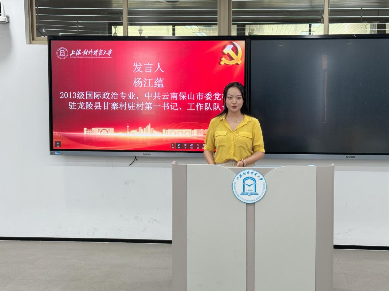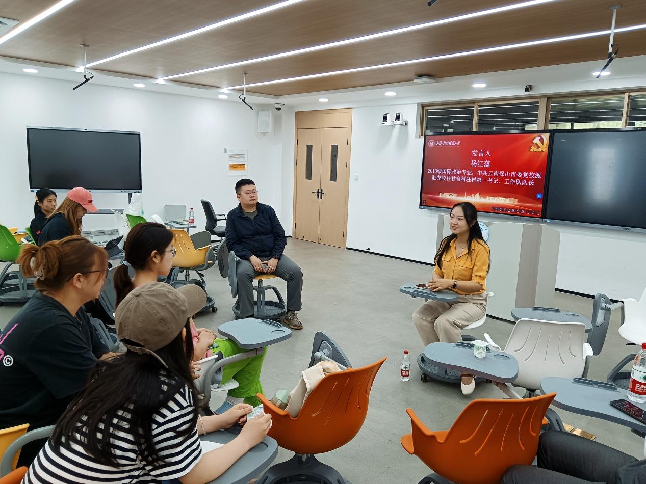 5月20日,国际组织学院(贸易谈判学院)国际关系学系教工党支部在学思楼D304教室召开“校友生涯发展论坛暨支部三全育人交流会”。2013级国际政治专业校友、中共云南省保山市委党校派驻龙陵县甘寨村驻村第一书记、工作队队长杨江蕴受邀分享自己的职业生涯发展心得,并与国际关系学系师生座谈交流。国际关系学系教师王金强、胡勇,辅导员王元昆及国际政治专业在校生近20人参加,系主任王瑞领老师主持本次活动。