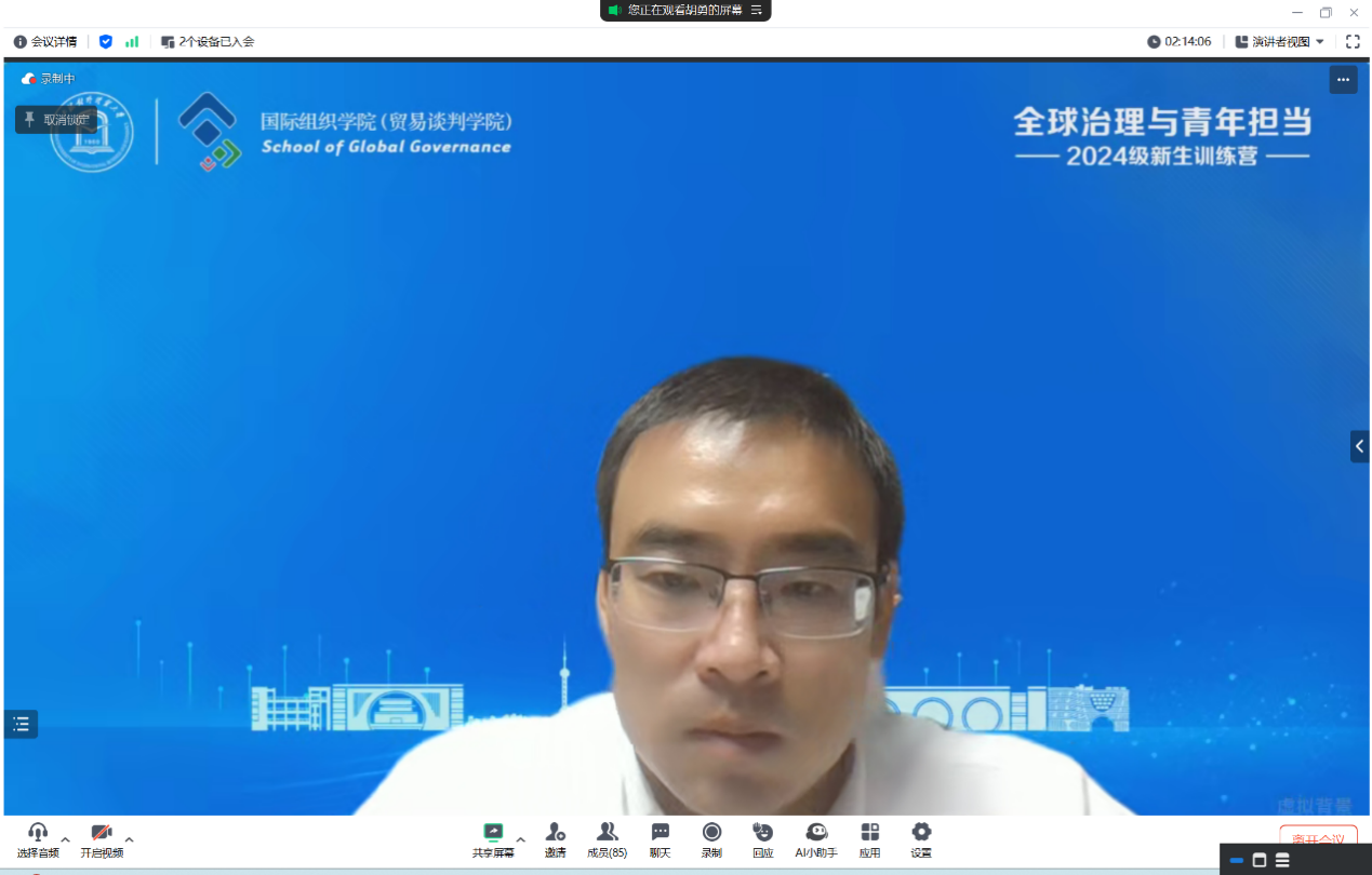 章益国在开班仪式上致辞。他向学院87名本硕博新生表示热烈欢迎,介绍了学校的发展历史、办学特色,以及国际组织学院(贸易谈判学院)组建的使命和人才培养目标。他指出,当前世界百年未有之大变局加速演进,我国如何更好地参与和引领全球治理,已成为时代重要课题。当代青年应当积极参与全球治理与合作,作为国际组织学院(贸易谈判学院)的青年学子,更是责无旁贷。他表示,学校和学院为首届新生精心组织了训练营活动,组建了一支由校内教师、在全球治理领域具有丰富理论和实践经验的校外专家,以及在国际组织任职的学长学姐共同组成的授课团队,课程内容丰富,针对性强,希望同学们能够珍惜训练营的学习机会,树立远大理想,明确奋斗目标,不断增强参与全球治理的意识和能力,未来成长为具有中国情怀、世界眼光、国际竞争力的国际组织后备人才。