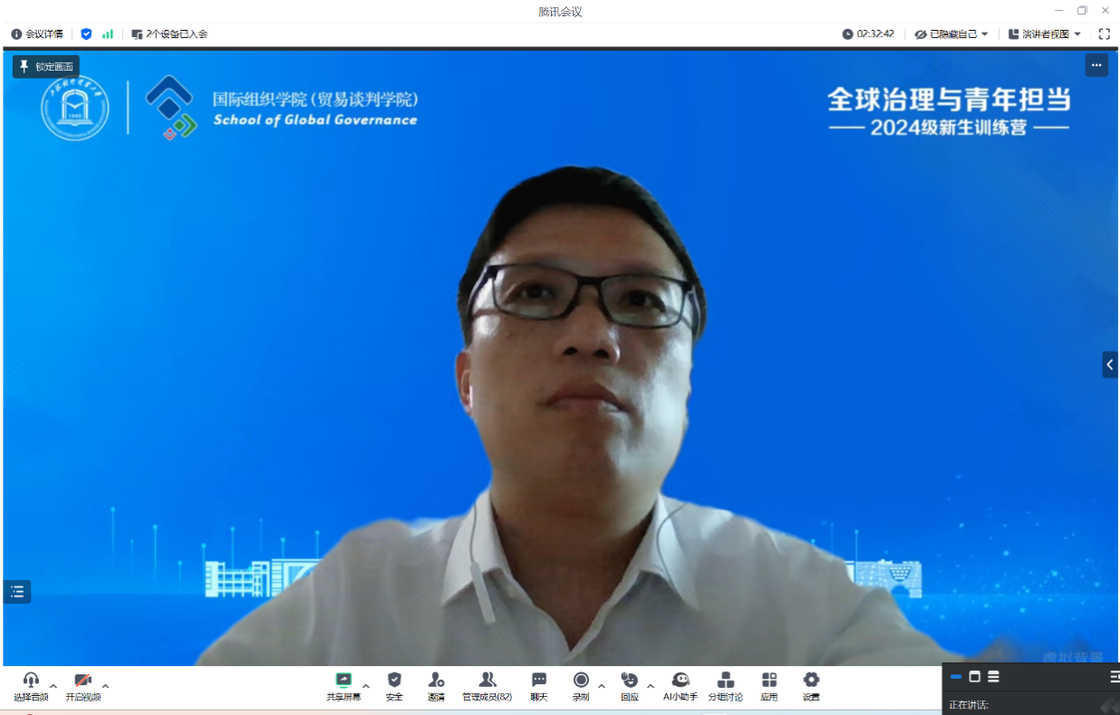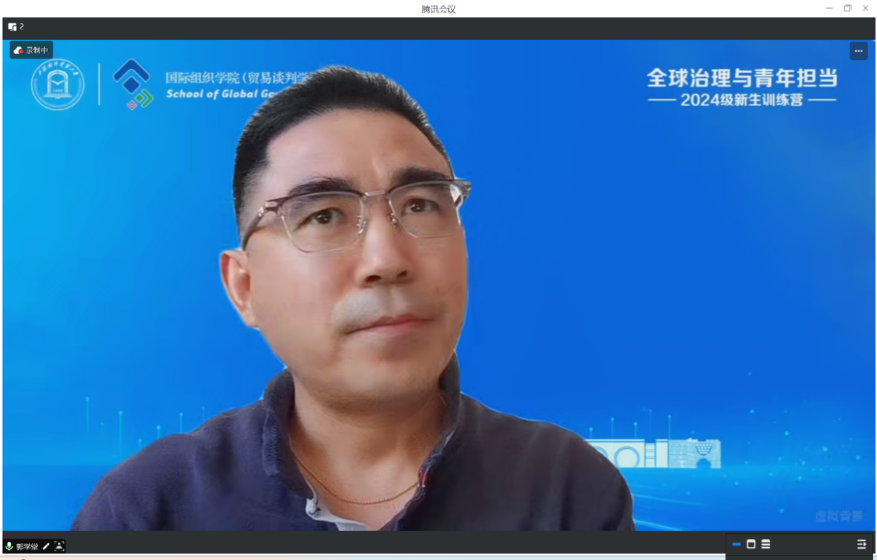 国际组织学院(贸易谈判学院)院长应品广围绕“培养具有全球胜任力的国际组织后备人才”介绍了学院概况。他向新生们阐述了“何谓全球胜任力”,并详细介绍了学院的发展进程、办学理念、人才培养定位、资源平台等内容,期望同学们努力成为高素质、复合型的国际组织后备人才。