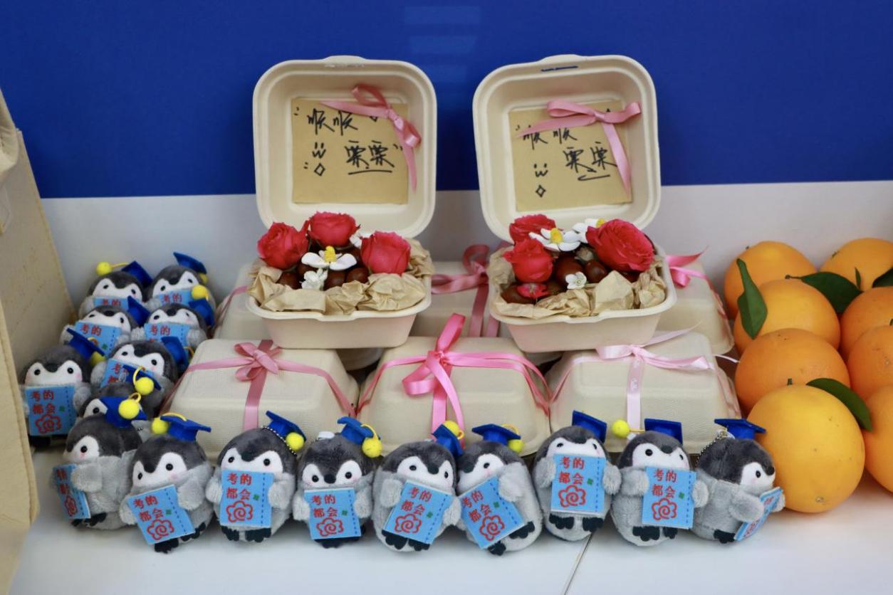 学院为每位考研学子准备了一份暖心“考研加油包”:一盒栗子,寓意考场顺顺“栗栗”;一颗脐橙,寓意“脐”开得胜、“橙”功上“岸”;一只研究生福气玩偶和一份文具用品。