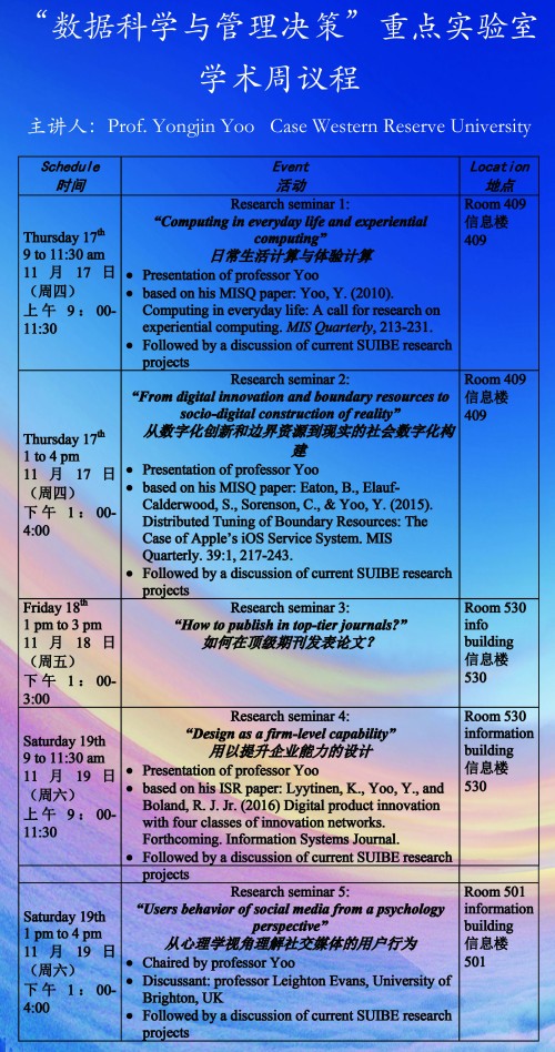 受必赢626net入口首页数据科学与管理决策重点实验室邀请,在必赢626net入口首页科研处的大力支持下,11月16日到20日,刚刚被Case Western Reserve University从Temple University纳入旗下的、国际信息管理与信息系统领域的学术大咖Youngjin Yoo教授将在数据科学与管理决策重点实验室进行为期1周的学术交流,期间将有5场精彩的学术报告或学术互动,欢迎校内外同行及同学们参加。