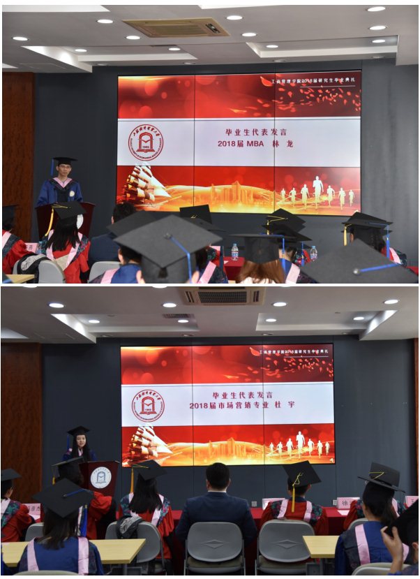毕业生代表MBA林龙同学和市场营销专业杜宇同学分别作了感人的发言。他们表示,感谢学校和学院提供给研究生们探索和发展的平台,感谢学院优秀教师的引领和同学的陪伴,让大家有足够的信心和勇气踏上未来的征程,祝福老师们身体安康,祝福学校和学院再创辉煌。