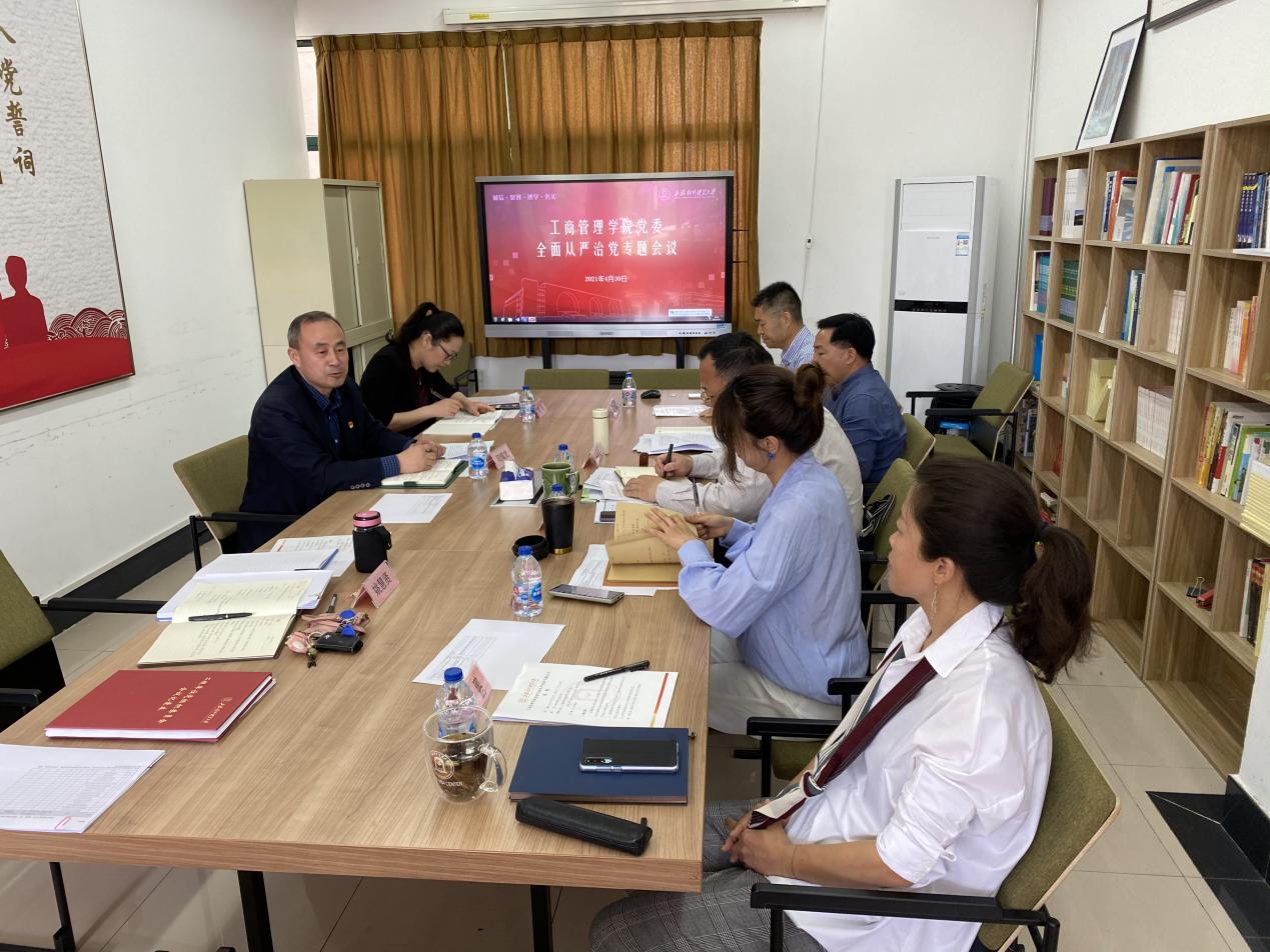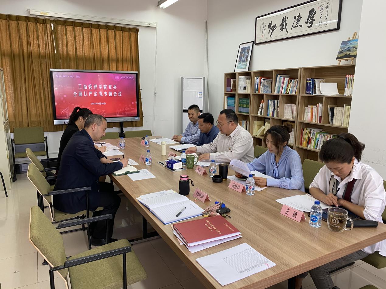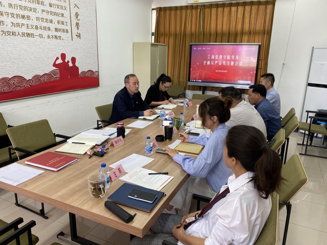 为了落实全面从严治党管党的政治责任,推动学院全面从严治党管党落到实施,工商管理学院党委于2021年4月30日上午召开了全面从严治党管党专题会议,校纪委(监察专员办公室)综合办公室主任司耀龙、校纪委(监察专员办公室)综合办公室纪检监察员吴迪出席,学院全体领导班子成员参加会议。会议由学院党委书记武增勇主持。