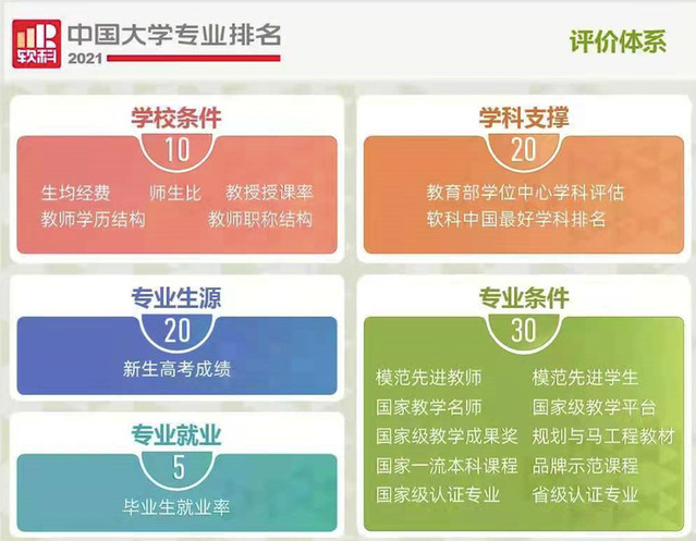 “软科中国大学专业排名”于2021年首次发布,排名覆盖92个专业类的509个本科专业,发布近3万个专业点,迄今为止覆盖专业数量最多、参评专业规模最大的中国大学本科专业排名。排名采用独具特色的学校-学科-专业三层次专业竞争力评价框架,设置学校条件、学科支撑、专业生源、专业就业、专业条件5个指标类别和19项指标,对1200多所高校的6万个本科专业点进行动态监测式评价。“软科中国大学专业排名”旨在为学生和家长选择本科专业提供客观参考,也为高校的本科专业建设与分析提供事实依据。