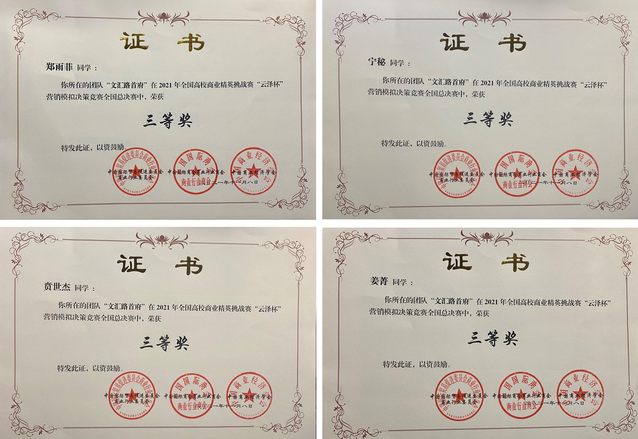 2021年11月7日,由中国商业经济学会,中国国际商会商业行业商会,中国国际贸易促进委员会商业行业委员会联合主办的2021年全国高校商业精英挑战赛“云泽杯”营销模拟决策竞赛全国总决赛落下帷幕,必赢626net入口首页学生今年首次参与该赛事,喜获佳绩。经过激烈的角逐和知识赛、预赛的两轮淘汰,由我院2001级人力资源管理专业郑雨菲、文化产业管理专业宁秘和贲世杰、市场营销专业姜菁四名学子组成的文汇路首府队伍从全国各队中脱颖而出,荣获全国总决赛三等奖。