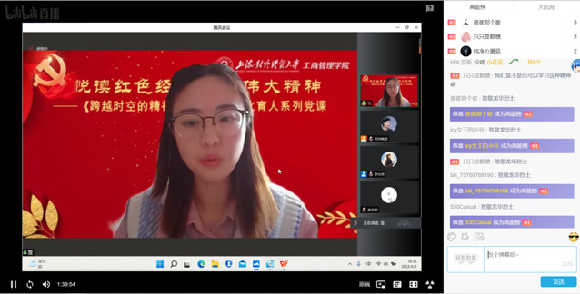 ●在工商管理学院党委的组织下,我收看了《悦读红色经典,传承伟大精神》直播党课,感悟颇深。习近平总书记强调一个有希望的民族不能没有英雄,英雄是民族最闪亮的坐标。本次党课总共通过“忠诚”、“奋斗”以及“牺牲”三个章节,向我们讲述了龙华英烈的故事,使我们感受到了龙华英烈的伟大品格。作为新时代的青年,我们应当在机遇面前主动出击,不犹豫、不观望;在困难面前迎难而上,不推诿、不逃避;在风险面前积极应对,不畏缩、不躲闪,努力传承英雄的伟大精神,为共产主义事业奋斗终身。