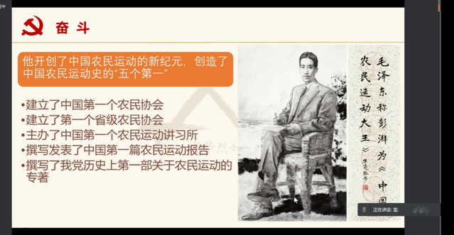 ●在“奋斗”这一精神的讲述过程中,老师先是向我们展现了她想要讲述的英烈的功绩。他开创了中国农民运动的新纪元,创造了中国农民运动史的“五个第一”,他就是彭湃——大地主阶级家庭的“富三代”。他深入农民,大多农民不能理解他所倡导的农民运动,他便走进农民家庭,与其交流。他为了农民生活的改造,为了农业的发展,为了农民的自治,为了农民教育的普及,奋斗了一生。