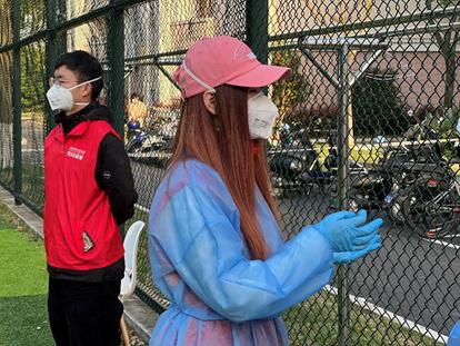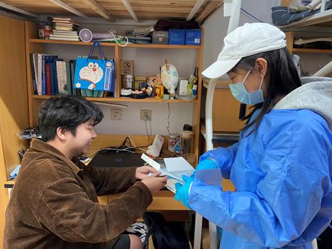 学校组建了一支社区党员志愿服务队,2021级研究生党员同志于思淼作为核酸志愿者负责人之一,参与每日核酸工作,机动处理现场各项工作调度。所有党员志愿者们一起,保障了社区内每轮核酸检测任务的顺利进行。在最近一次重点人群核酸和全员紧急核酸中,上岗时长长达10个小时。于思淼回忆说“那天核酸码刚开始使用,为加快扫码的速度,我们在入场前,临时增加了一道人工核验核酸码的工序。”“我和另一位负责人,大概校对了全校五六千学生的核酸码,练就了迅速识别混入其中健康云截图的本领。”防护白、防护蓝、志愿红凝聚了很多力量,用爱守护着我们共同的“健康绿”。