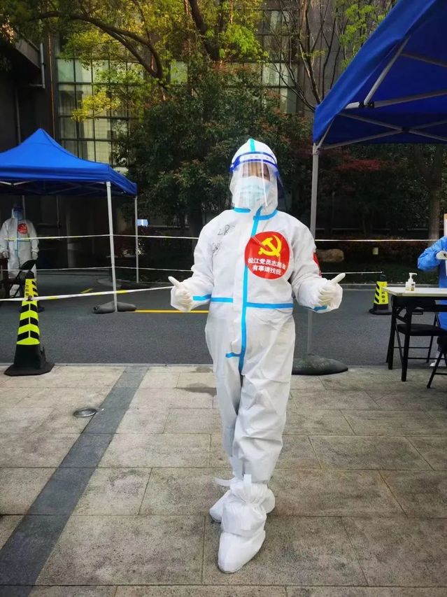 市场营销系教工党支部党员左鹏在社区参与核酸检测志愿服务,每次站岗均达五、六个小时,防护服常常被汗水浸湿,但她说:作为一名党员教师,应该用实际行动给学生做个榜样。