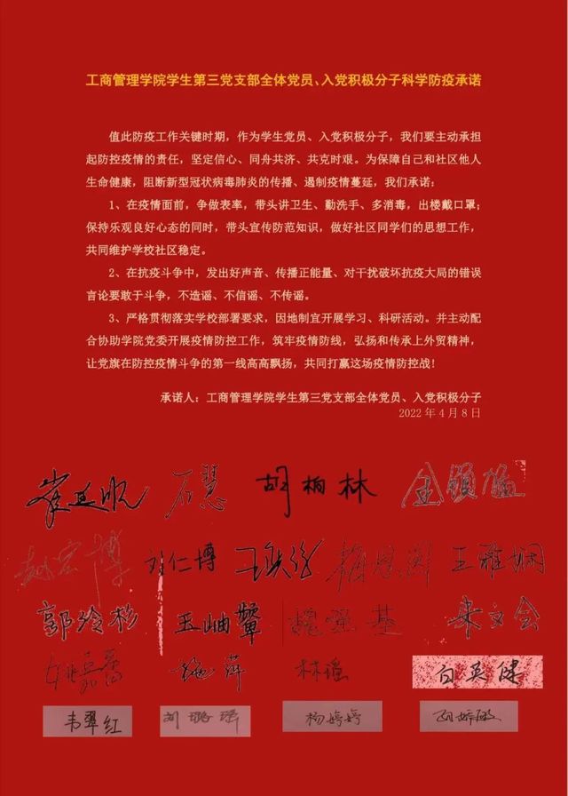 每一名入党积极分子签订《工商管理学院防疫承诺书》,积极响应上海市委和学校的防疫号召及《上海市致全市党员的一封信》,主动学习、冲锋在前、担当作为。