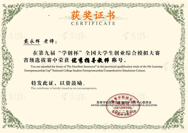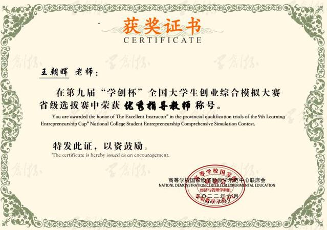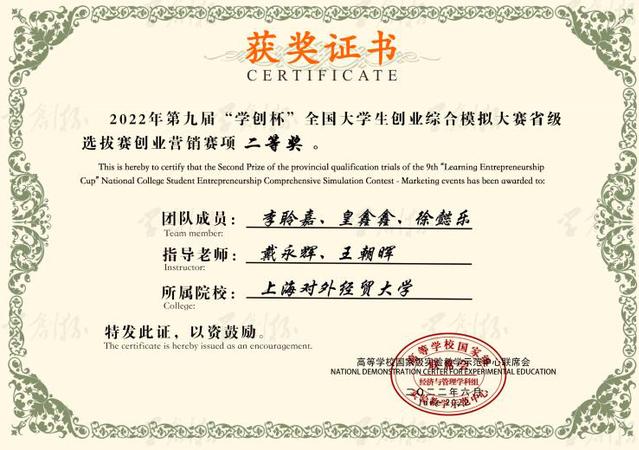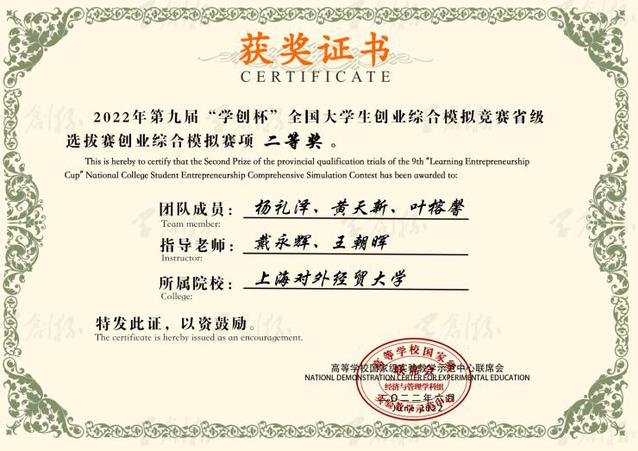近日,第九届“学创杯”全国大学生创业综合模拟竞赛上海市选拔赛落下帷幕。历经激烈角逐,工商管理学院本科学生杨礼泽、李聆嘉负责组队的二组队伍,在王朝晖副院长和戴永辉老师的倾心指导下,斩获创业综合模拟赛项二等奖、创业营销赛项二等奖各一项,两位老师获得“优秀指导教师”称号。