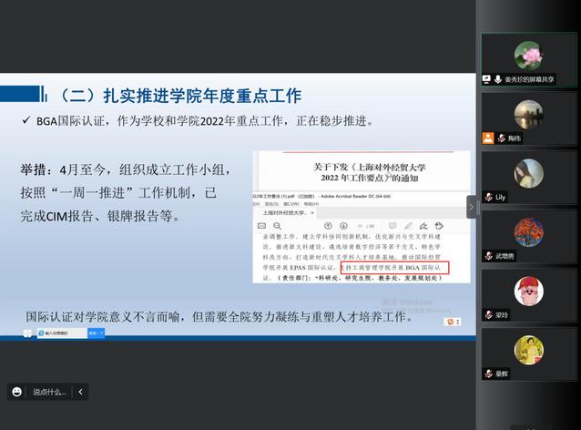 随后她着重从就业与招生培养联动改革、重质量人才培养工作优化、南泰研究院年度计划、MBA办学资源相关情况等四个方面报告了学院聚力深化改革创新,加快推动就业与招生培养联动改革、人才培养质量、MBA项目办学等重要领域和关键环节改革提质步伐。她表示,BGA国际认证工作对学院意义不言而喻,需要全院师生共同努力。下一步学院将围绕BGA国际认证样板专业建设工作、工商管理博士点建设与申报工作、十四五发展规划年度指标等要求持续加强内涵建设,有序推进学院事业高质量发展。