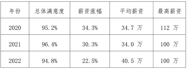 2022 届毕业生平均薪资较前两年有所提高,达到 40.5 万年薪。通过数据调查,近三年毕业生的职业转化率为 29.8%,创业率 9.1%,平均薪资涨幅为 29.03%,平均薪资为 36.4 万。总体呈现比较好的趋势,如表 2 所示。