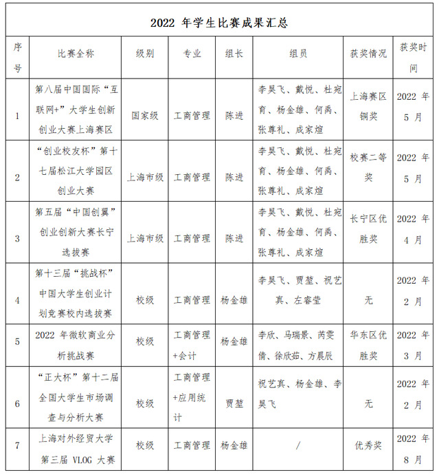 2022年11月,由工商管理学院教师齐佳音、徐波、王朝晖、谢佩洪、阎海燕、张国锋、奚红妹、杨军敏、戴永辉撰写的《“抓重破难、内外集成”的工商管理人才培养探索与实践》论文荣获上海市优秀教学成果一等奖。2022年12月,第二届上海市高校教师教学创新大赛中,齐佳音荣老师获上海教学成果一等奖;第十三届“中国创造学会创造成果奖”活动中,戴永辉老师荣获二等奖;2022年全国高校商业精英挑战赛“云泽杯”营销模拟决策竞赛中,韩睿老师获得“优秀指导教师”称号;第九届“学创杯”全国大学生创业综合模拟竞赛上海市选拔赛中,王朝晖、戴永辉获得“优秀指导教师”称号。