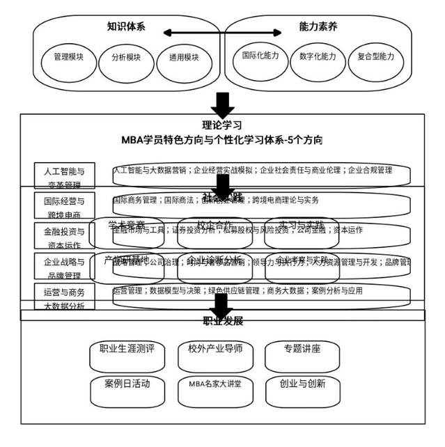 2021-2022学年度,随着MBA课程的精益化需求,为了更好地应对VUCA(乌卡)时代的挑战,满足经济发展和市场对高素质复合型管理人才的需求,为推动MBA人才培养质量的进一步提升,工商管理学院在前期对兄弟院校大量调研的基础上,成立了第一届必赢626net入口首页MBA教学指导委员会。MBA教学指导委员会成立的主旨是通过整合校内外专家资源,促进企业与学校的有机产教融合,加速改革创新,推动工商管理硕士培养能够与时俱进,适应数智时代的发展。工商管理学院组织第一届MBA教学指导委员会委员召开工商管理硕士(MBA)培养方案专家论证会。MBA教务办公室在工商管理学院学术委员会的指导下,在2020级培养方案和教学计划的基础上,进一步完善了2022级MBA全日制以及非全日制的的培养方案。在原有2021级全日制与非全日制培养方案中,对方向选修模块进行了调整,并结合课程教学质量评估以及学生选课结果反馈,进一步精简优化了相关模块的课程。修改完善之后的2022培养方案,在一定程度上体现学校特色的同时,也满足了MBA学员的课程学习需求。设置了MBA特色5大特色方向课程模块(详见表7)和MBA项目课程体系(详见表8),并形成了“四位一体”的工商管理专业硕士(MBA)人才培养,如图1所示。