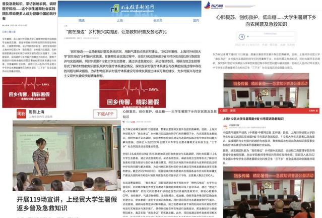 在我院左鹏等指导老师的带领下,“救在身边”团队扎实推进应急救护培训和宣讲工作已有三余年。团队走进学校,与各级教育部门配合,开展大中小学校急救宣讲活动;走进农村,结合“三下乡”暑期社会实践活动,为村民讲解应急救护常识,提高村民自救互救能力;走进社区,在居委会、社区党建中心定期宣讲;走进企业;走进机关,对社会展开全面培训。团队以学校所在地松江区为起点,累计共覆盖9省15市,培训654场,宣讲志愿6099小时,受益总人数19300人次,成立以来被多家媒体报道,获得多项荣誉。