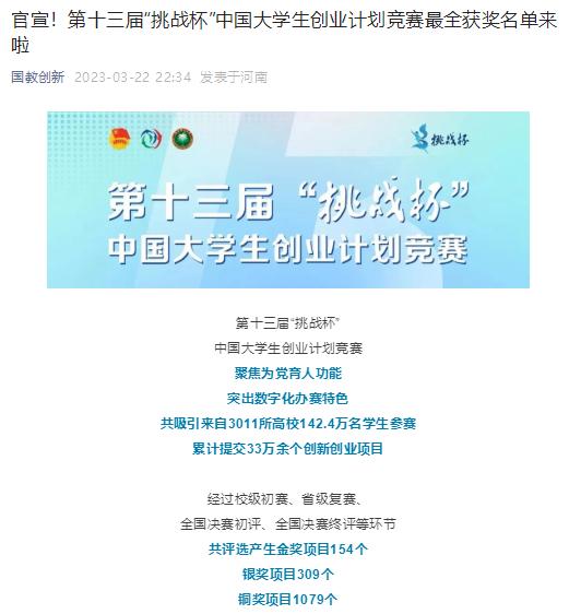 l 国赛铜奖,第十三届“挑战杯”中国大学生创业计划竞赛