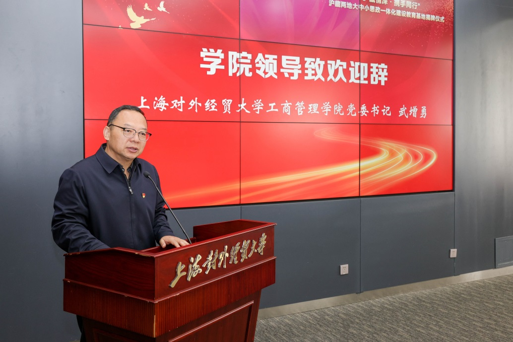 祁明在讲话中表示,在学校深入开展学习贯彻习近平新时代中国特色社会主义思想主题教育之际,我们在这里举办“沪藏两地大中小思政一体化建设教育基地揭牌仪式”具有重要意义,学校十分重视发挥大中小思政一体化协同育人机制在传播党的创新理论,落实立德树人根本任务中的重要作用。工商管理学院将党的创新理论与学院党建特色优势相结合,开展了一系列具有“开创性、特色性和可复制”的红色班会品牌活动,获得媒体和社会的广泛关注。他指出,本次西藏定日县和松江区各中小学的教师代表们来到上经贸大校园,正式开启沪藏两地大中小思政一体化建设教育基地的新征程,希望以本次揭牌仪式为契机,整合利用好沪藏两地丰富独特的红色教育资源,共同促进红色教育资源在大中小学生中纵向衔接、横向贯通。最后,他表达三点期望:一是要聚焦主题,让协同育人“大课堂”真正“热起来”;二是要创新载体,让红色育人资源充分“转起来”;三是要知行合一,让大中小思政一体化全面“实起来”。