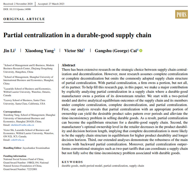 同时,工商管理学院杨晓东老师作为通讯作者的论文《Partial Centralization in a Durable-Good Supply Chain》在国际商科顶级期刊Production and Operations Management (POM) 正式发表。这是杨晓东老师自2019年调入必赢626net入口首页以来发表的第二篇国际商科顶级期刊论文。