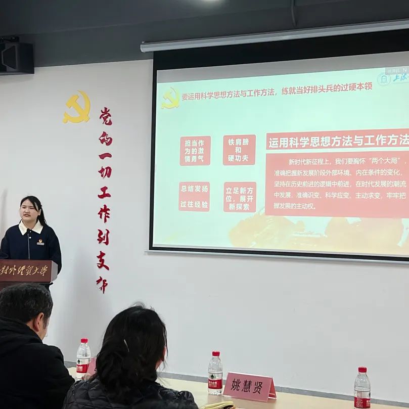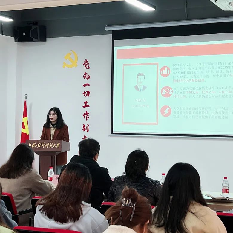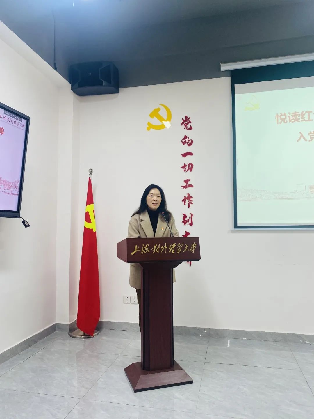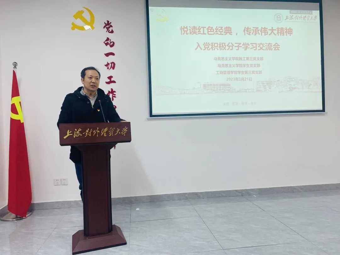 随后,工商管理学院入党积极分子胡高娥、孟优分别以《弘扬伟大建党精神,争做新时代追梦人》为主题,结合《习近平在上海》、《当好改革开放的排头兵——习近平上海足迹》进行红色书籍读书感悟分享。马克思主义学院入党积极分子孙敏慧、吴妙琦分别就《以青春之名,担时代之责》、《感悟中国之理的思想精髓》进行读书分享交流。未来属于青年,希望寄予青年。新时代青年责任在肩、使命崇高,应当在红色经典中汲取精神动力和智力支撑,勇于成为建设社会主义现代化国家的排头兵。