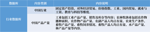 宏观数据库收录数据的时间跨度为1949今,包含国内外年度、季度、月度宏观数据。主要包括:国民经济核算、固定资产投资、财政、对外贸易经济、价格指数、工业、国内贸易、银行货币、利率汇率、证券市场、人口与资源、就业与工资、人民生活、教育与科技、景气指数、建筑业、邮电运输业、农林牧渔业等维度的数据。