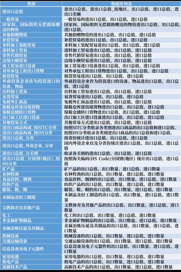 海关数据库收录数据的时间跨度为1994今,包含海关履行进出口贸易统计职能中产生的各项进出口统计数据,分为中国海关进出口、中国海关进出口全口岸和国际海关三大类数据库。