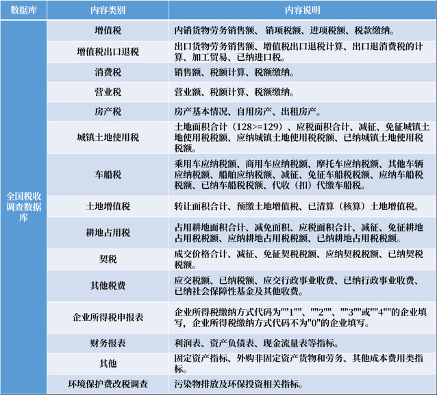 全国税收调查数据收录了与税务相关的年度数据,时间跨度为2007年至2016年。该数据库具体涵盖增值税、增值税出口退税、消费税、营业税、房产税、城镇土地使用税、车船税、土地增值税、耕地占用税、契税、其他税费、企业所得税申报表、财务报表、环境保护费改税调查、其他等大类指标。