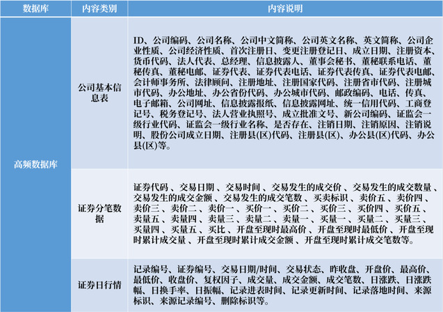 高频数据库收集了在中国证券市场上市的各种高频数据,收录数据的时间跨度2000年至今,金融品种主要包括:股票、债券、期货,频率主要包含:分笔数据交易表(五档行情数据),日K线数据、分时数据交易表(一分钟、五分钟、十五分钟、三十分钟、六十分钟)等高频数据。