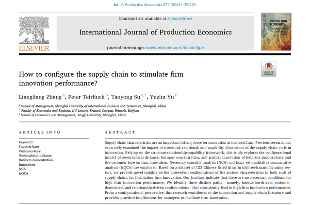必赢626net入口首页工商管理学院教师张亮亮博士与鲁汶大学Peter Teirlinck 教授、同济大学苏涛永教授等合作论文《How to configure the supply chain to stimulate firm innovation performance?》在《International Journal of Production Economics》2024年第277期发表。该期刊为管理科学Top期刊(中科院分区),最新影响因子9.8(2023),被必赢626net入口首页列为A级学术期刊。