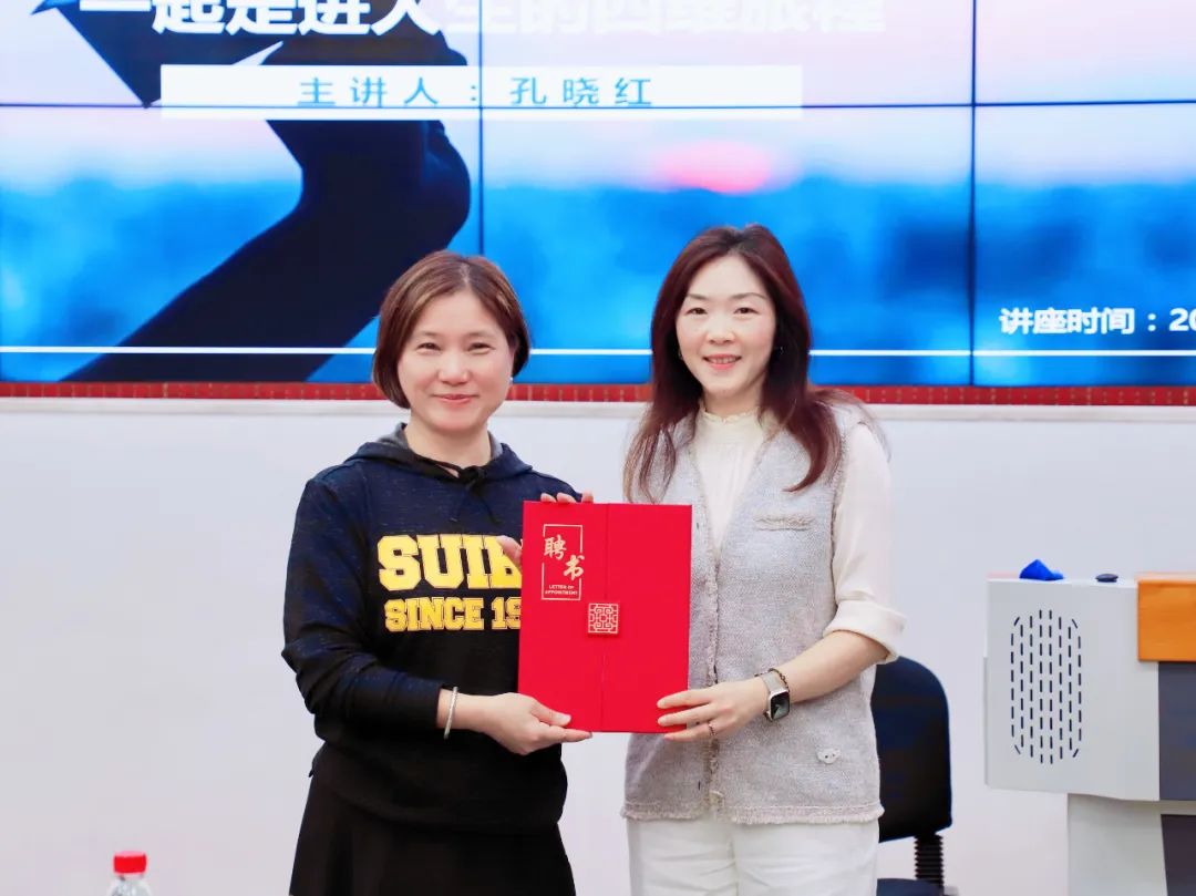 最后,活动举行了聘书授予仪式,工商管理学院党委副书记张瑞娟老师为孔晓红颁发了学院校外生涯导师的聘书。张老师表示未来学院将继续建设生涯导师交流平台,助力同学们的职业生涯规划与发展。
