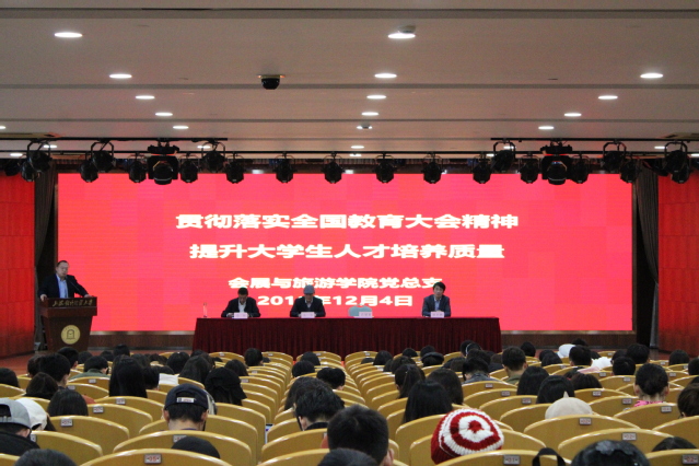 2018124日中午,会展与旅游学院党总支召开了学院全体学生大会,学习贯彻全国教育大会精神学风建设动员大会。会上学院党总支书记武增勇向全体学生讲解了全国教育大会精神,围绕习近平总书记提出的“培养社会主义建设者和接班人”的目标、和“在坚定理想信念、厚植爱国主义情怀、加强品德修养、增长知识见识、培养奋斗精神、增强综合素质上下功夫的具体要求,结合当前大学生在学业中存在的问题和困惑,进行了解读。同时武增勇结合当前学校开展的学风建设活动,通过列举发生在学生身边的例子和数据,告诫全体同学,务必要加强政治理论学习,不断提高自己的思想认识和道德修养,树立正确的世界观、价值观、人生观,把个人发展和祖国需要相结合,努力学习,使自己成为德智体美劳全面发展的合格的社会主义建设者和接班人。