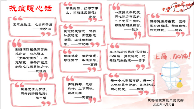党员同志同时写下抗疫暖心话,鼓励学生坚定信念、齐心协力、互帮互助,相信我们一定能战胜疫情,期待线下相聚。