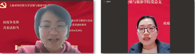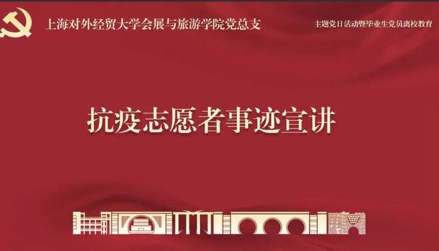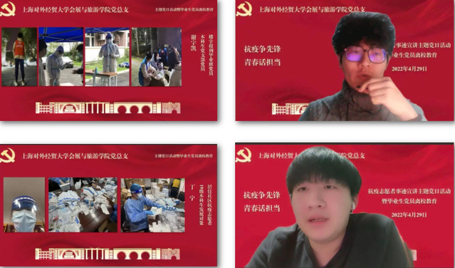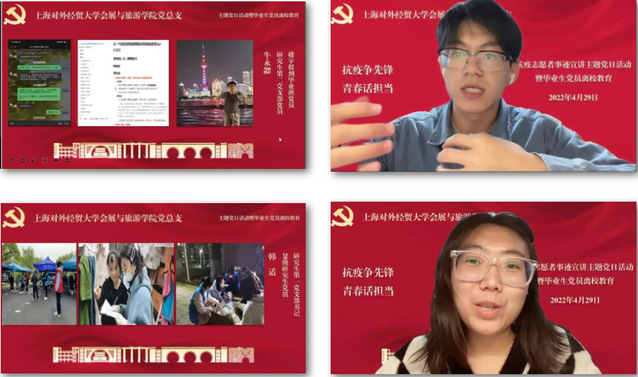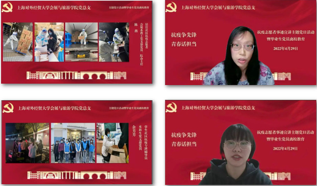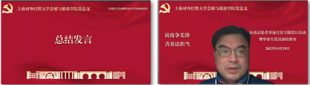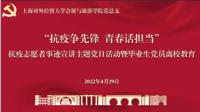 在上海本轮疫情的特殊时期,我院会展与旅游学院的党员教师、学生通过多种方式、多维度地参与抗疫志愿服务中,为学习和宣传他们的事迹,引导大家提高思想认识、端正入党动机,汲取力量,坚定信心,进一步加强疫情期间党员教育管理,结合习近平总书记在中国人民大学考察时重要讲话精神,于4月29日晚,专门组织开展了“抗疫争先锋 青春话担当”抗疫志愿者事迹宣讲主题党日活动暨毕业生党员离校教育。学院领导班子、教师代表、组织员、辅导员及全体学生党员、发展对象和入党积极分子参加了本次会议,由本科生党支部书记王元义主持。