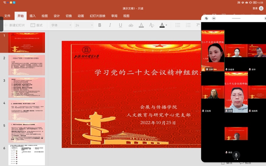 1025日,人文教育与研究中心党支部召开线上会议,共同学习党的二十大报告。各位党员立足本职工作,结合本支部的教学及工作特色,从自身角度出发,围绕着教育与文化、传承与创新等问题,从实干兴邦的层面思深入思考,并展开了热烈的讨论交流。