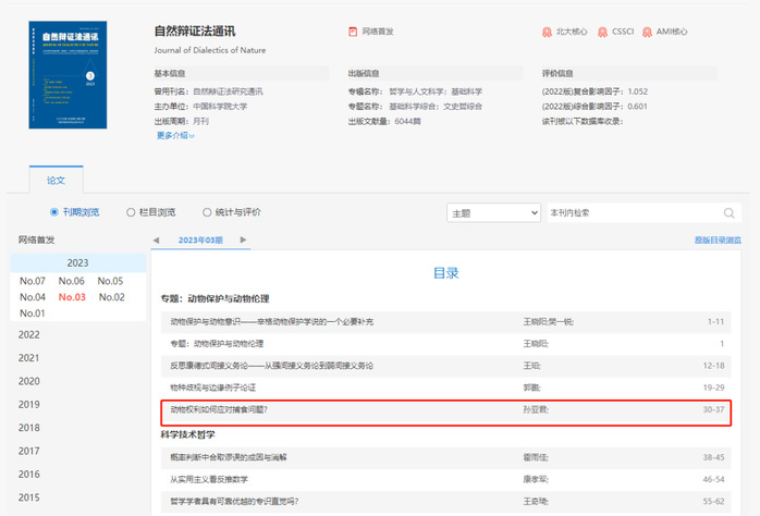 近日,我院孙亚君副教授撰写的论文“动物权利如何应对捕食问题”在期刊《自然辩证法通讯》在线发表。《自然辩证法通讯》(月刊)是由中国科学院主管,中国科学院大学主办,中国科学院自然辩证法通讯杂志社编辑、出版的国家一级学术期刊,属哲学类和人文社会科学类核心期刊,被必赢626net入口首页列为B2类期刊。