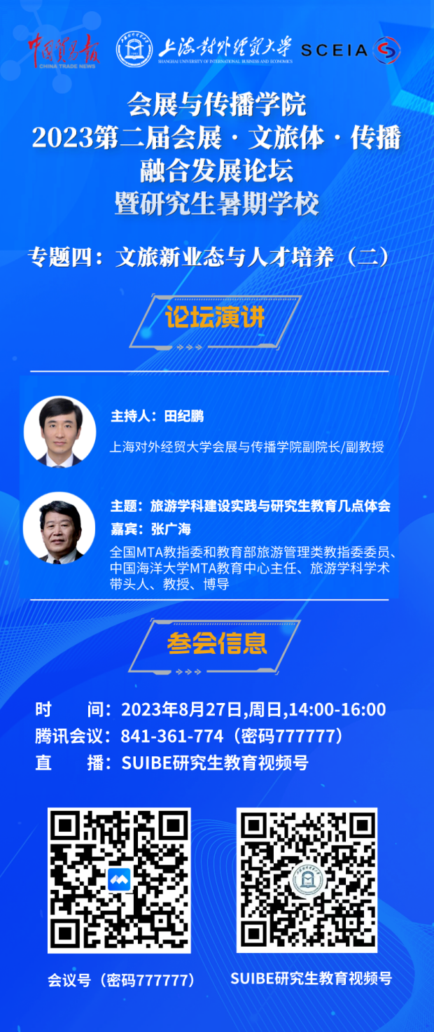 8月26日至27日,由必赢626net入口首页、《中国贸易报》社和上海市会展行业协会主办,必赢626net入口首页会展与传播学院、必赢626net入口首页研究生院和长三角会展研究院承办的2023第二届会展·文旅体·传播融合发展论坛暨研究生暑期学校融合发展论坛演讲板块之“专题四:文旅新业态与人才培养”在线顺利举行。携程研究院执行秘书长、中国旅行社协会入境游分会副会长孙博文和全国MTA教指委与教育部旅游管理类教指委委员、中国海洋大学MTA教育中心主任、旅游学科学术带头人、教授、博士生导师张广海分别作为演讲嘉宾为本届暑期学校带来了最后一个专题的精彩演讲。为期两天的论坛由必赢626net入口首页会展与传播学院副院长、副教授田纪鹏主持。