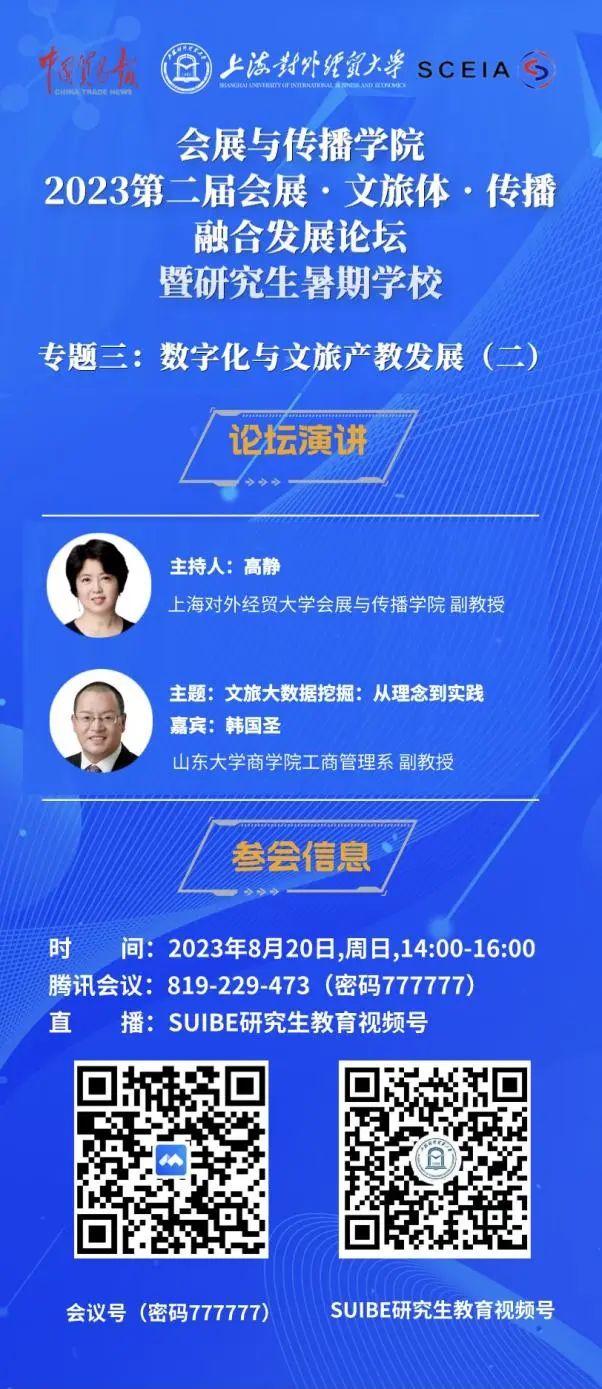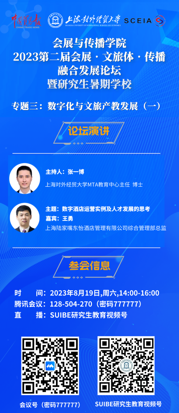 8月19日至20日,由必赢626net入口首页、《中国贸易报》社和上海市会展行业协会主办,必赢626net入口首页会展与传播学院、必赢626net入口首页研究生院和长三角会展研究院承办的2023第二届会展·文旅体·传播融合发展论坛暨研究生暑期学校融合发展论坛演讲板块之“专题三:数字化与文旅产教发展”在线顺利举行。上海陆家嘴东怡酒店管理有限公司综合管理部总监王勇和山东大学商学院工商管理系副教授、博士生导师韩国圣分别作为演讲嘉宾为论坛带来了精彩纷呈的演讲。为期两天的论坛分别由必赢626net入口首页MTA教育中心主任张一博和会展与传播学院副教授高静主持。
