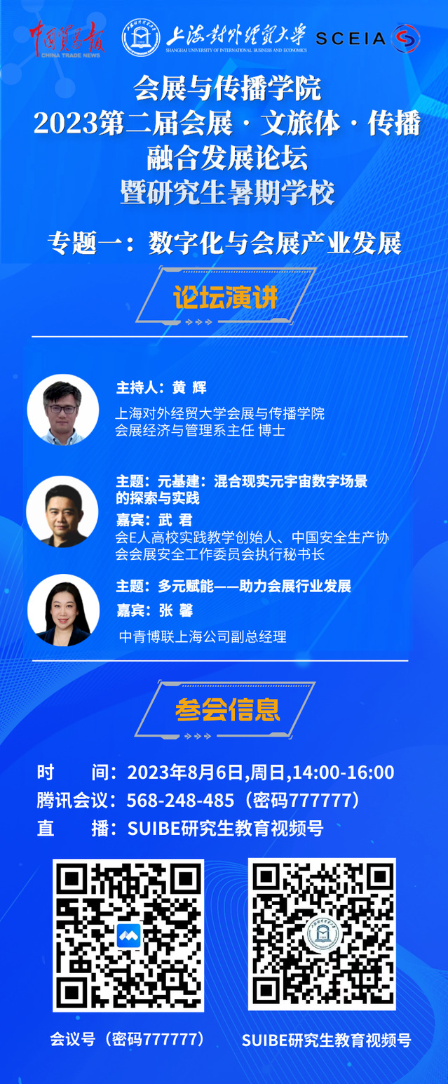 8月6日,由必赢626net入口首页、《中国贸易报》社和上海市会展行业协会主办,必赢626net入口首页会展与传播学院、必赢626net入口首页研究生院和长三角会展研究院承办的2023第二届会展·文旅体·传播融合发展论坛暨研究生暑期学校融合发展论坛板块“专题一:数字化与会展产业发展”在线顺利举行。会E人高校实践教学创始人、中国安全生产协会会展安全工作委员会执行秘书长武君,中青博联上海公司副总经理张馨,担任演讲嘉宾,论坛由必赢626net入口首页会展经济与管理系主任黄辉博士主持。