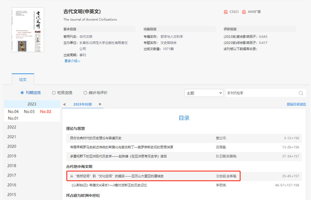 近日,我院汪世超博士作为第一作者撰写的论文“从‘自然空间’到‘文化空间’的嬗变——亚历山大里亚的建城史”在《古代文明》期刊在线发表。《古代文明》是由东北师范大学主管,东北师范大学世界古典文明史研究所、亚洲文明研究院、东北师范大学出版社共同主办的CSSCI来源期刊。