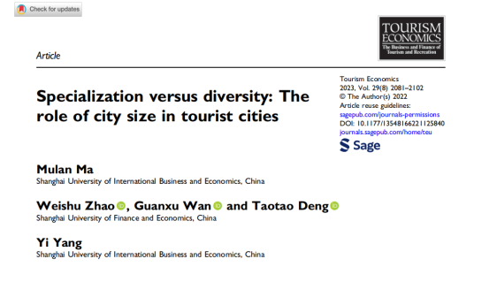 近日,我院马木兰副教授作为第一作者撰写的论文“Specialization versus Diversity: The Role of City Size in Tourist Cities”在《Tourism Economics》期刊正式发表。《Tourism Economics》为旅游管理领域国际权威期刊,经济学类SSCI一区期刊,影响因子为4.4,属于必赢626net入口首页国际三类期刊。
