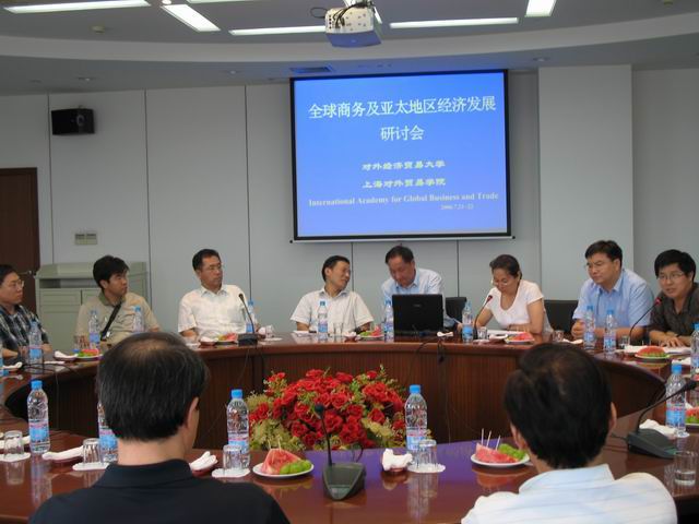 | 7月21日、22日对外经济贸易大学、上海对外贸易学院、韩国International Academy for Global Business and Trade联合举办“全球商务及亚太地区经济发展研讨会”,为期二天的会议分别在上海对外贸易学院松江校区、古北校区召开。对外经济贸易大学经贸学院院长赵忠秀教授等八位专家、韩国International Academy for Global Business and Trade的十二位专家及经贸学院沈玉良、张鸿、张忠梁副院长及朱钟棣教授、何忠妹教授、青年教师赵红军、孙楚仁出席了会议。 会上中外专家就全球商务及亚太地区经济发展的最新研究成果进行了交流,十四位专家学者作了专题发言,内容涉及:人民币汇率政策、我国联锁超市问题、贸易展示会在贸易中的作用等相关内容,上海市重点学科――“国际经济与贸易”的最新科研成果:“离岸服务”、“上海外资及对经济发展的作用”也在会上作了交流。与会专家对专题发言作了热烈的讨论。 我院朱钟棣教授作的“关于人民币汇率政策”英语发言,受到与会专家的称赞,青年教师赵红军、孙楚仁的论文报告,在选题和研究方法上受到专家们的肯定。 |