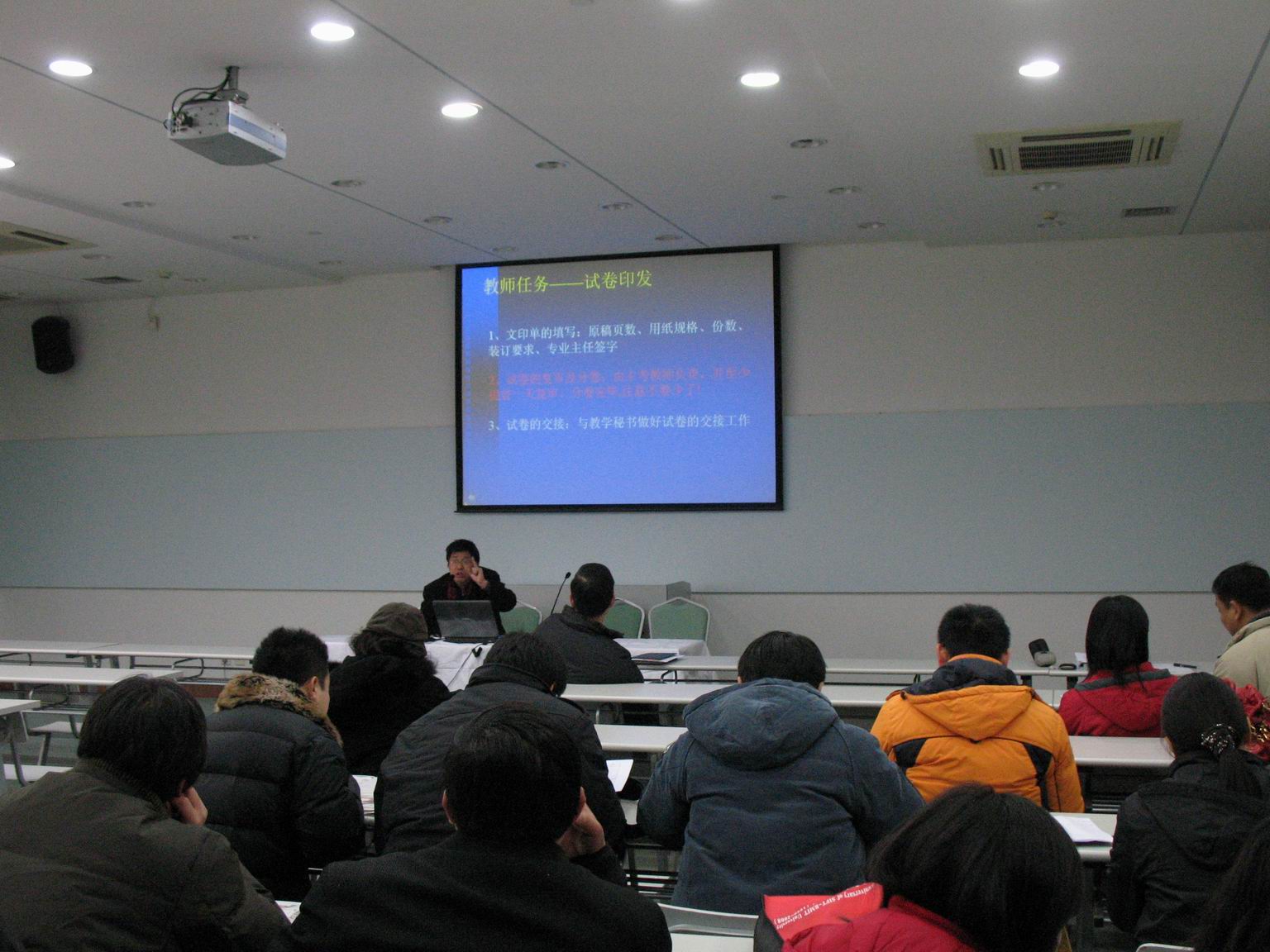| 12月26日下午,经贸学院于信息楼532会议室召开了期末考试工作动员大会。出席会议的有经贸学院张鸿副院长、张忠梁副院长以及学院全体教职工。 针对即将到来的全校期末考试工作,张鸿副院长首先向全体教师介绍了学院的考试工作安排,并着重强调了在组织安排考试工作中,必须注意的几个关键环节:考前、考后试卷清点,考前清场,在批改试卷时仔细核对成绩,及时提交学生平时成绩和考试成绩等,并要求新进校的青年教师尽快熟悉学校关于考试工作的相关规定,圆满完成本学期的期未考试工作。 张忠梁副院长在会上再次提示大家关注考试期间学校班车的调整时间和交通路况,以及强调了维护考场纪律。 会前,学院办公室已将本次考试安排,教师监考规定等相关文件装订成册,发到每位教师手中。 |