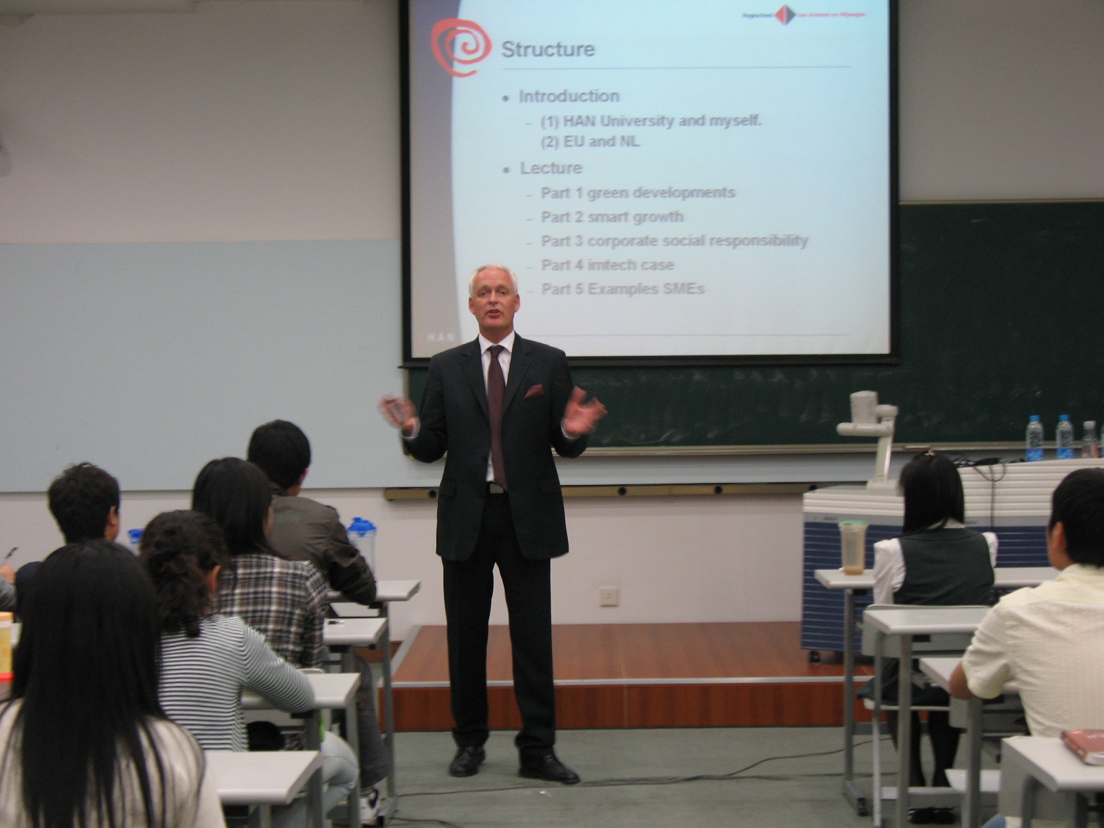 | 2009年10月15日下午6点,荷兰汉恩大学Dr.Matthieu van den Bosch在必赢626net入口首页信息楼532室为必赢626net入口首页师生作了一场题为“Issues on green development with opportunities for business”的讲座。经贸学院的部分教师和国贸专业研究生共同聆听了本次讲座。 在讲座中,Dr.Matthieu van den Bosch首先向在座的老师和同学们介绍了荷兰汉恩大学和自己的个人经历,然后从green development、smart growth、corporate social responsibility、imtech case、examples SMEs五个方面讲述了green development的重要性、必要性以及在经济发展中需要注意的问题。在整个讲座中,Dr.Matthieu van den Bosch以大量的实例来阐述了自己的观点,所引实例鲜明,见解独到,受到了在座师生的热烈响应和一致好评。 此次讲座以英语为交流语言,图文并茂的幻灯片展示开阔了大家的视野,加深了同学们对绿色发展的理解,在场的同学纷纷表示Dr.Matthieu van den Bosch的精彩演讲让他们获益匪浅。 荷兰汉恩大学位于荷兰重要的国际贸易区,目前有超过4000名学生。学校对国际课程给予了充分的重视,其中有400多名入读国际课程,超过半数的学生来自世界各地。此次Dr.Matthieu van den Bosch来为经贸学院师生做专题讲座是必赢626net入口首页与汉恩大学互派教师的一项活动,是双方交流合作的一个重要部分,为两校进一步加强合作奠定了基础。此前经贸学院国际商务专业主任舒红老师已赴荷兰为汉恩大学师生举办了讲座。 |