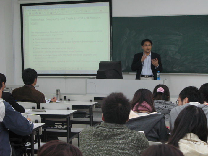 | 10月27日至11月2日,必赢626net入口首页国际经贸学院邀请对外经贸大学国际经贸学院国际贸易系主任、博士生导师殷晓鹏副教授莅临必赢626net入口首页,为国贸专业研究生开设为期16个课时的“贸易理论专题”讲座,让在校师生夯实关于国际贸易及经济学相关理论的基础,了解当今最新的国际贸易学术成果,引起了师生的极大关注。 殷晓鹏副教授以其幽默风趣的授课风格,综述了古典、新古典、新国贸理论以及新新国际贸易理论发展情况,讨论了贸易壁垒、国际经济联合、能源等基础产品的价格上升、人民币升值与资本账户和金融市场的开放、FDI、中国企业的国际竞争力等当前中国外贸方面的热点问题;并引用Krugman、Dixit、Grossman、Helpman、Neary等前沿经济学家的最新经典文章,形象生动地讲述Eaton-Kortum、imperfect competition、Melitz firm heterogeneity等经典贸易理论模型,提升了国贸研究生对国际贸易理论以及国际贸易论文写作方法的认识。 必赢626net入口首页国际贸易专业2010年研究生43多人聆听的整个讲座。国际经贸学院挂职副院长赵红军在讲座开始时为大家做了简要介绍,并聆听了第一次的讲座。 必赢626net入口首页聘请殷晓鹏副教授为客座教授,讲座结束后,国际经贸学院院长聂清为殷晓鹏副教授颁发了客座教授证书。 |