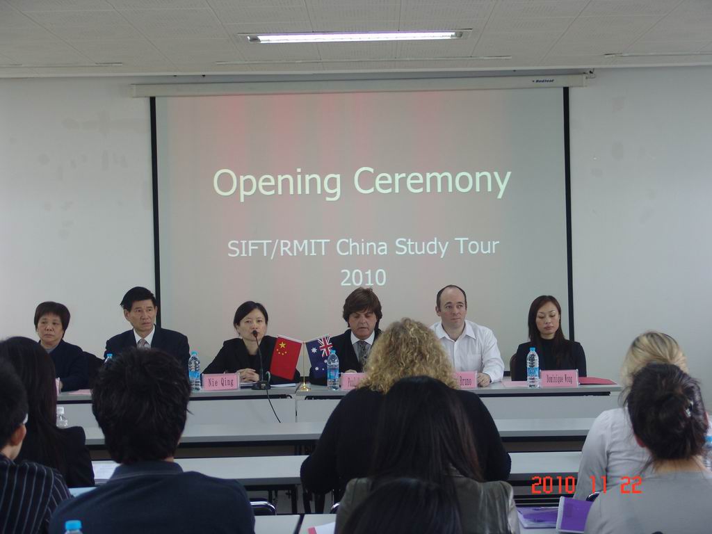 | 11月22日上午九点,在古北校区学位后培训基地举办了“澳大利亚RMIT大学2010年中国文化之旅”开学典礼,正式开启了本年度中澳两校合作的文化交流活动。出席本次开学典礼的有经贸学院院长聂清老师,副院长张忠樑老师,教师代表何忠妹教授,RMIT中国文化之旅带队老师Paul Cerrotti先生, Vince Bruno先生,Ying Foon Wong女士等老师。中外合作项目学生工作主管田勤老师主持了此次开学典礼仪式。