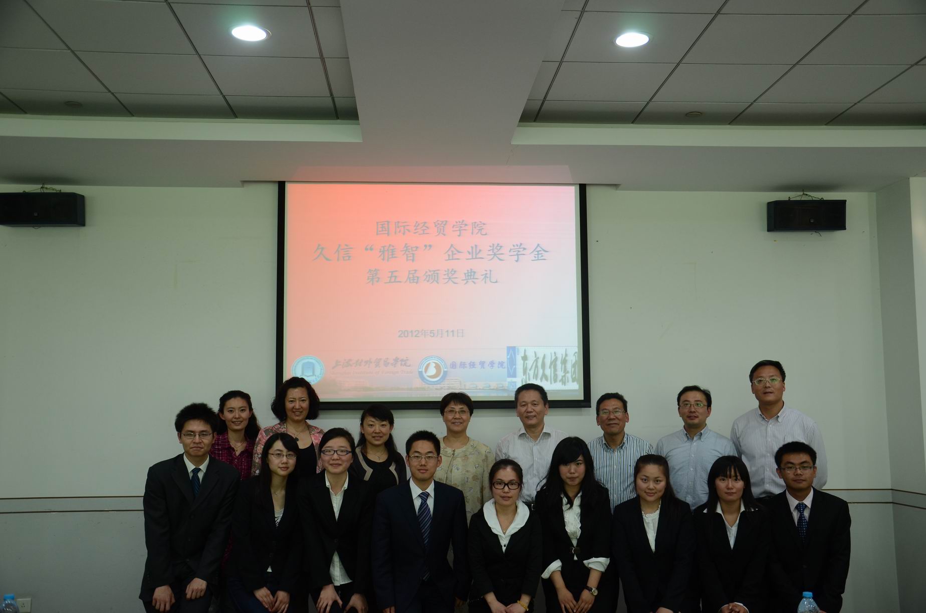 | 2012年5月11日下午1点,国际经贸学院第五届久信“雅智”企业奖学金颁奖典礼在信息楼530隆重举行。上海东方久信集团有限公司副总经理王一明先生,办公室主任安琳女士,徐辉先生,国际经贸学院院长沈玉良教授,副院长赵红军教授、总支副书记张彦老师以及院长助理金泉副教授受邀出席了本次典礼。