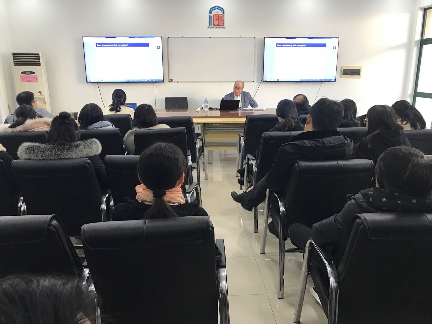 紧随聘任仪式,Berkowitz教授向在场师生介绍了他最新的工作论文:“Government Transparency and Corruption: Evidence from a quasi-natural Experiment”。Berkowitz教授首先向大家回顾了中国政府信息公开改革历程,并以2012年政府信息公开制度改革为准自然实验,运用双重差分的方法探讨了政府信息透明度与腐败的关系。研究结果表明,政府的信息公开能够有效抑制腐败的发生,文章还通过工业用地价格、医疗等福利机构数量的变化对影响机制进行了验证。随后,在场的老师同学们纷纷就讲座主题提出自己的见解和问题,Berkowitz教授对听众提出的高质量问题表示充分的肯定,并做出了悉心回答。