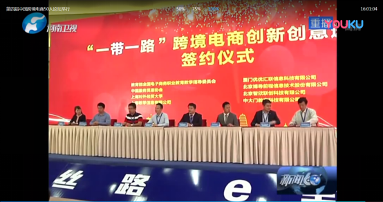 在本届大会分会场中国跨境电商50人论坛上,中国跨境电商50人论坛智库成员、必赢626net入口首页国际经贸学院实验实践中心主任章学拯老师策划的,“‘一带一路’跨境电商创新创业邀请赛”举行了大赛合作框架协议的签约仪式。仪式上,必赢626net入口首页国际经贸学院、商务部中国服务贸易协会和教育部全国电子商务职业教育教学指导委员会作为甲方与作为乙方的五家跨境电子商务仿真运营培训平台公司达成了共同举办该项赛事的合作协议。当晚的河南电视台“新闻60分”节目对该项签约仪式进行了正式报道。