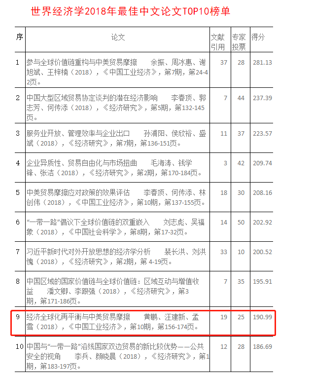 日前,由《世界经济年鉴》编辑部组织评选的世界经济学十佳(TOP10)论文榜单发布,我院两位教授,何欢浪、汪建新的论文分别入选。