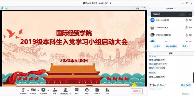 5月8日下午13时,国际经贸学院2019级本科生党章学习小组成立大会如期在线上召开,学院党委副书记邵雅菁老师、党委组织员陈雅媚老师、辅导员于卓老师和何逸涵老师共同参与了本次大会。